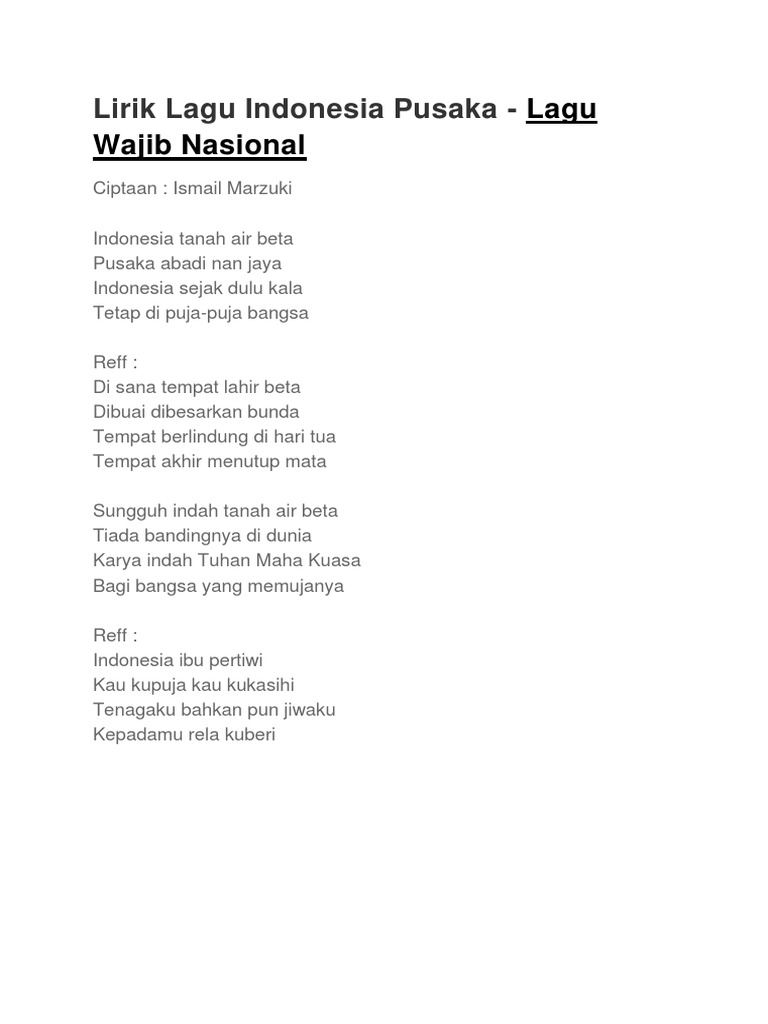 Lirik indonesia pusaka lirik lagu indonesia pusaka diciptakan oleh ismail marzukikita sebagai masyarakat khususnya generasi muda sebagai penerus bangsa yuk rame rame kita lestarikan lagu nasional dan daerah indonesia. C indonesia tanah air beta am d g pusaka abadi nan jaya c f indonesia sejak dulu kala c g c. Lagu indonesia pusaka memiliki sebuah lirik yang khas yang dapat kita ambil maknanya.