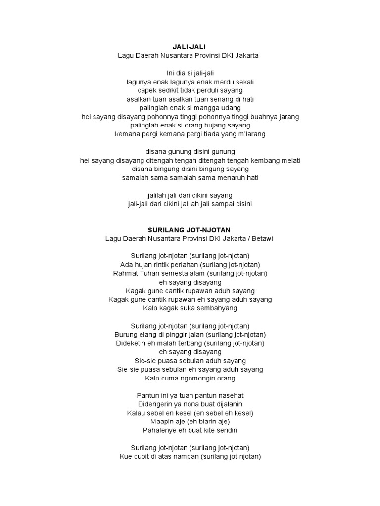 Lagu wajib nasional lengkap dengan not balok dan not angka serta lirik. Semoga dengan adanya luasan di atas bisa menambah wawasan ilmu pengetahuan serta bisa dijadikan referensi utama lagi kamu semua untuk memperdalam kecintaan terhadap lagu tradisional indonesia. Walaupun sudah sangat maju beberapa penduduk asli jakarta masih tetap setia melestarikan kebudayaan warisan nenek moyang salah satunya adalah lagu lagu daerah. Ini dia si jali jali.