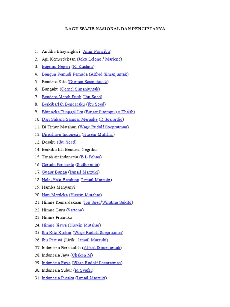 Kalau perlu kamu pakai trik long screenshot deh biar bisa simpan daftar 40 lagu wajib nasional dan penciptanya di galeri. Kamu bisa lihat beberapa di antaranya lewat tabel yang jaka kasih berikut ini kok. Lirik dan notasi lagu ini kemudian dipublikasikan pada surat kabar sin po edisi 10 november 1928 dengan judul lagu indonesia.