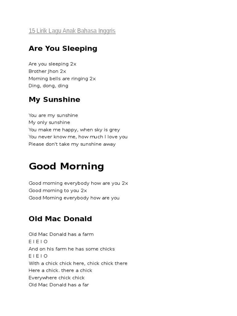 15 lirik lagu anak anak dalam bahasa inggris. Melon melon watermelon lagu simple dalam bahasa inggris untuk anak anak. Syair lagu inggris tersebut bisa divariasikan dengan lagu lagu bahasa indonesia lainnya.