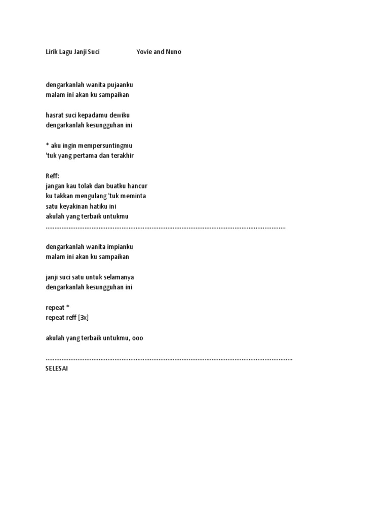 Lirik lagu janji suci yovie and nuno Indeed lately has been hunted by users around us, perhaps one of you personally. People are now accustomed to using the net in gadgets to view video and image information for inspiration, and according to the title of the post I will talk about about Lirik Lagu Janji Suci Yovie And Nuno.