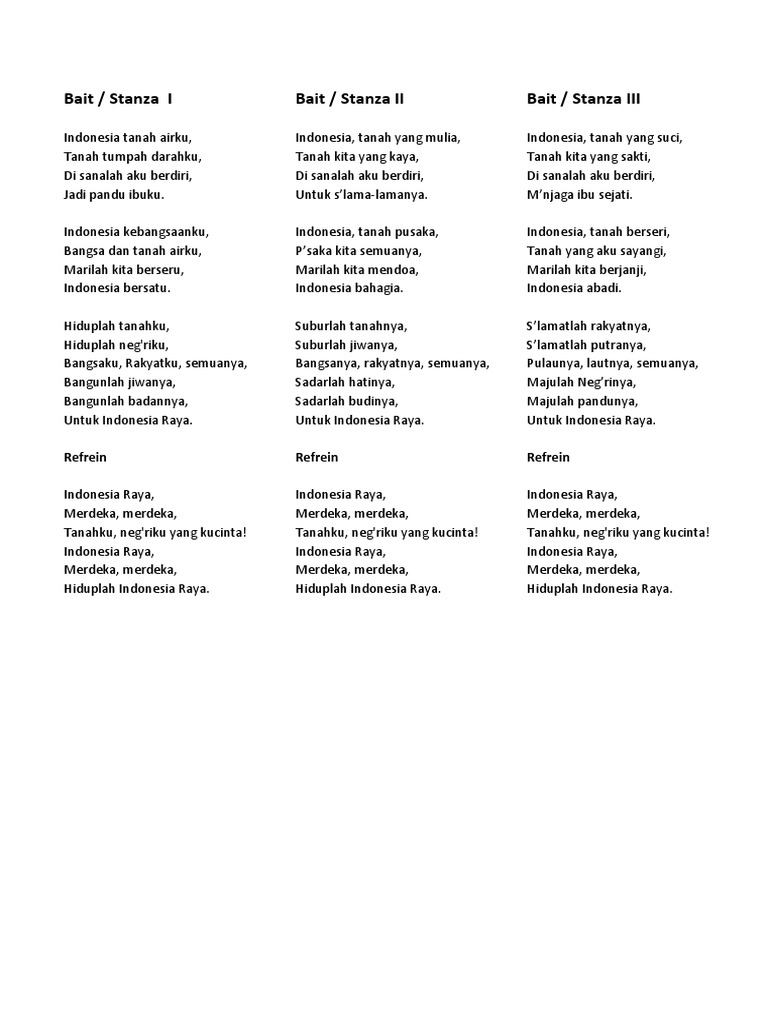 Berikut ini lirik lagu indonesia raya 3 stanza berdasarkan pp nomor 441958. Lagu indonesia raya stanza 1 stanza 2 dan stanza 3 stanza 1. Mungkin penulisannya bukan supratman tapi soepratman jaman dulu huruf u itu adalah oe.